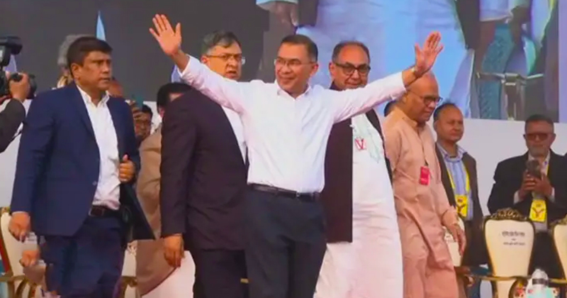 লাল-সবুজে সাজানো একটি বিশেষ বাসে করে শাহজালাল আন্তর্জাতিক বিমানবন্দর থেকে গণসংবর্ধনাস্থলে পৌঁছে বেলা ৩টা ৫০ মিনিটে মঞ্চে ওঠেন তারেক রহমান। বেলা ৩টা ৫৭ মিনিটে বক্তব্য শুরু করে তিনি প্রথমেই বলেন, ‘প্রিয় বাংলাদেশ।’ এ সময় মঞ্চে উপস্থিত ছিলেন বিএনপির শীর্ষ নেতারা। নেতা–কর্মীদের উদ্দেশে হাত নেড়ে শুভেচ্ছা জানান তিনি।